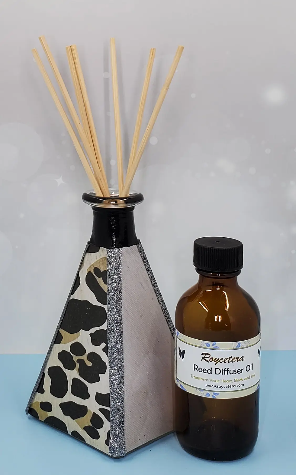 Glass bottles in pyramid shape to hold your favorite reed diffuser oil. 4 sides are decoupaged in many bold and fun combinations outlined with contrast glitter borders, and metallic painted top bands. The pyramid shape is tip-over resistant. Includes 1 free bottle of reed diffuser oil (found in Scents for Home & Body), plus 1 set of reeds.
